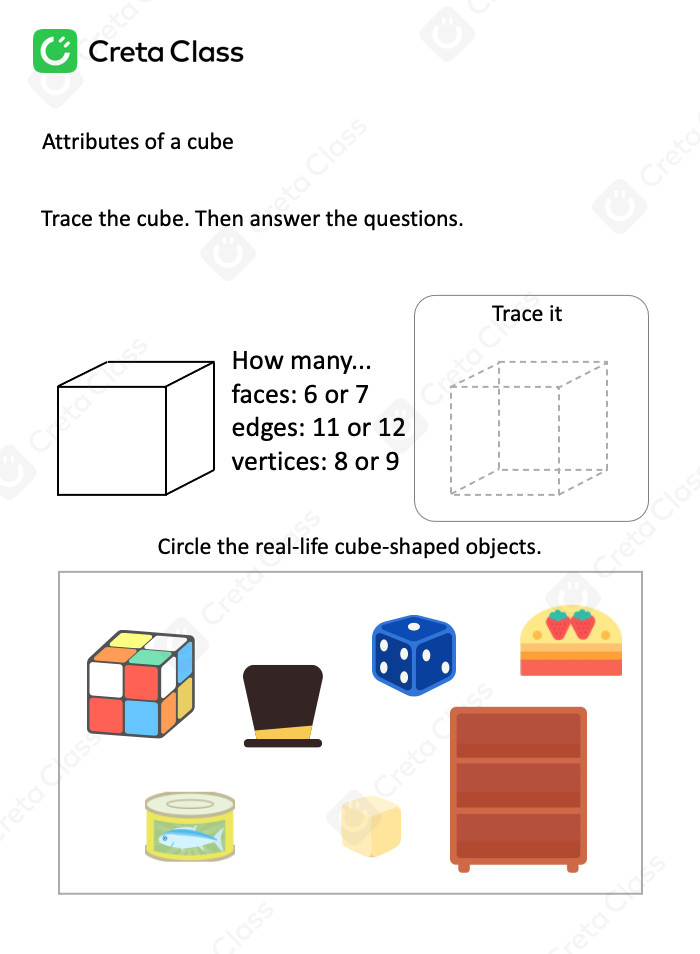 Trace the cube. Then answer the questions.