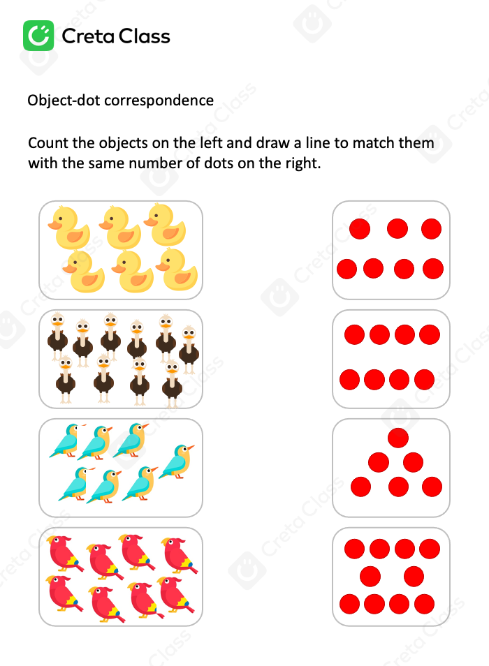 Count the objects on the left and draw a line to match them with the same number of dots on the right.