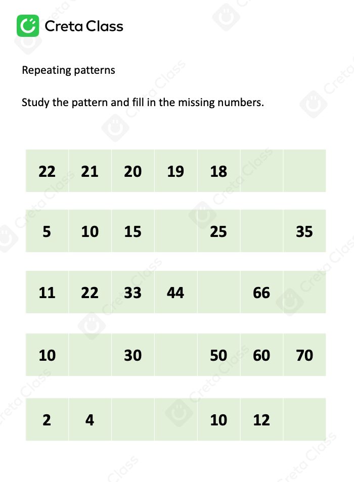 Study the pattern and fill in the missing numbers.
